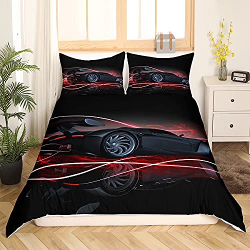 Loussiesd Black Red Car Duvet Cover Set Double Size for Boys Kids Teens Men Speed Sports Car Bedding Set Race Car Comforter Cover with 2 Pillowcases Soft Microfiber Zipper Unique Automobile 3 Pcs