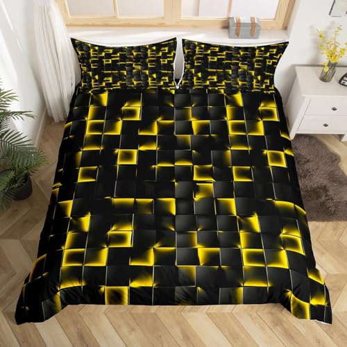 Homewish Geometric Checkered Quilt Cover Double Size Neon Black Gold Duvet Cover for Kids Teen Men Gaming Room Decor, Abstract Ombre Plaid Bedding Set Grids Bed Set, Microfibre