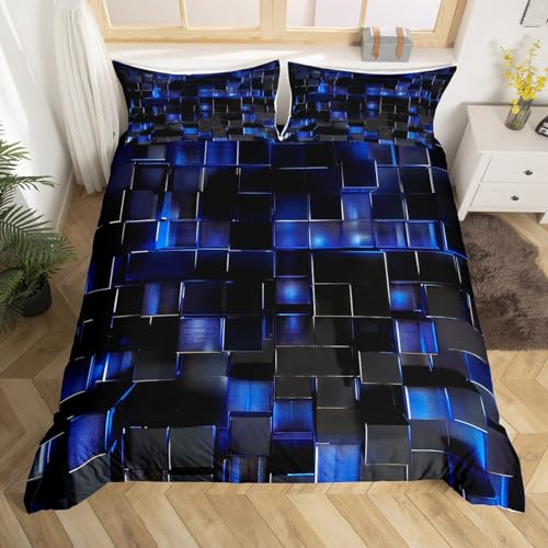 Black Navy Blue Duvet Cover Modern Geometric Comforter Cover Gradient Neon Cubes Boys King Size Bedding Set,Abstract Square Grid Bed Set Lattice Wall Brick Decor