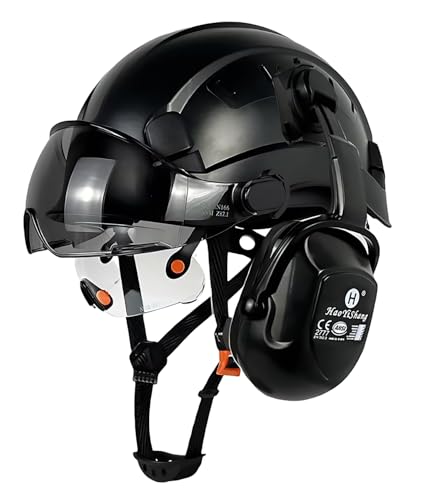 HaoYiShang Industrial Safety Helmet with Visor Ear defenders Muffs Protection Black Hard Hat Vented OSHA Hardhats hard hats construction Work Head Protection Certified Black Helmets Double goggles