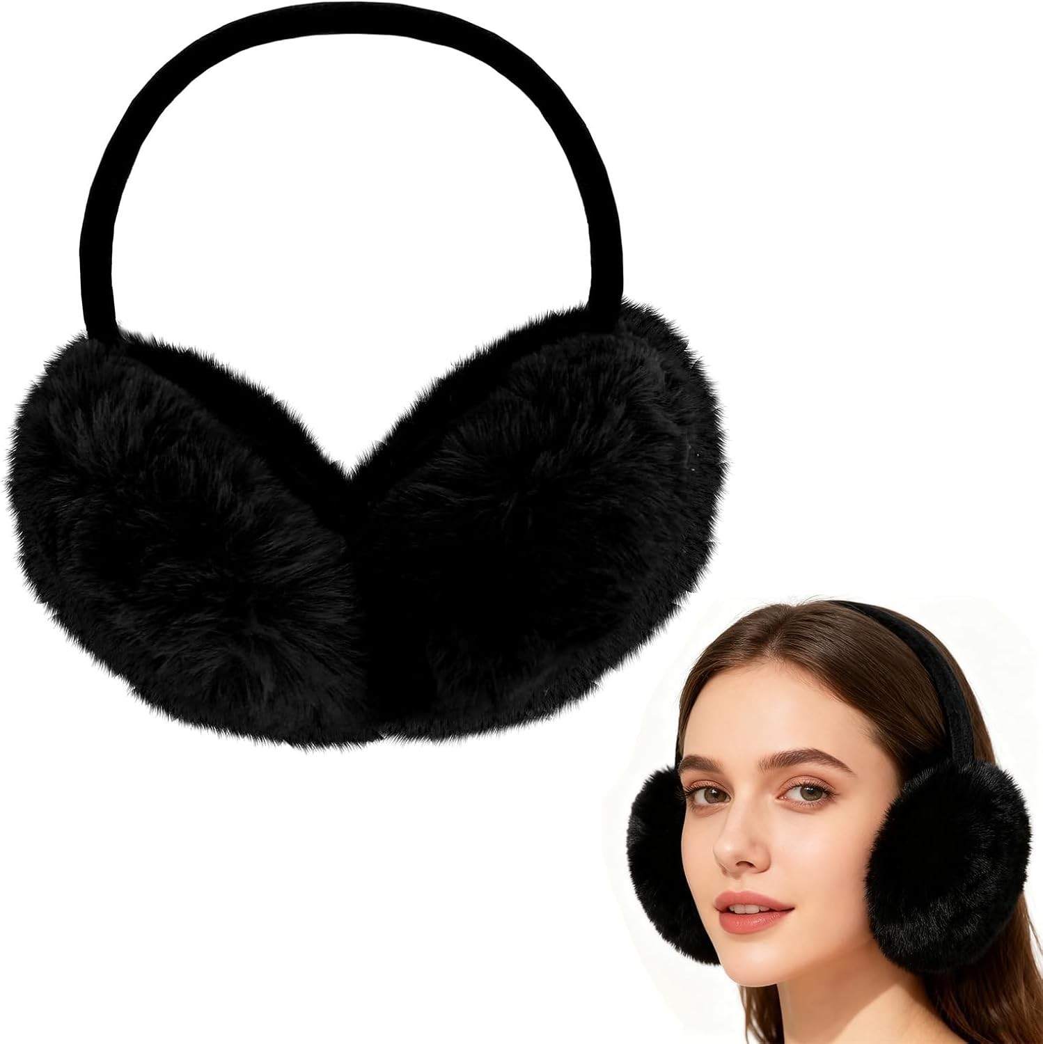 (Black) Winter Ear Muffs for Women - Foldable Soft Faux Fur Ear Warmers, Cold Weather Outdoor Covers