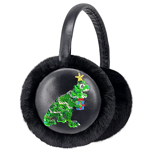 Gifts Treat Boys Earmuffs Kids Leather Ear Muffs Kids in Plush Adjustable Winter Warm Toddlers Ear Warmers with Flip Sequin Dinosaur Pattern for Boys, Black Sequins