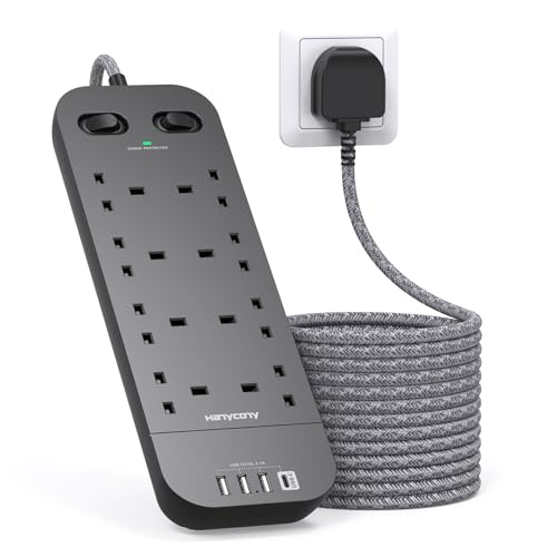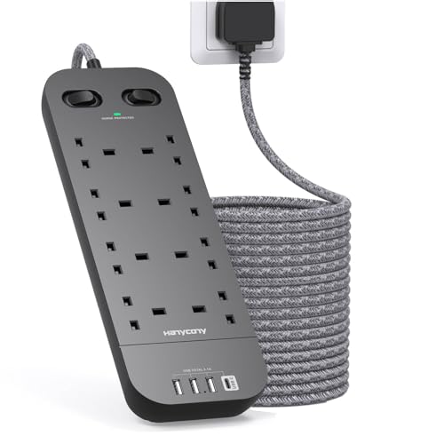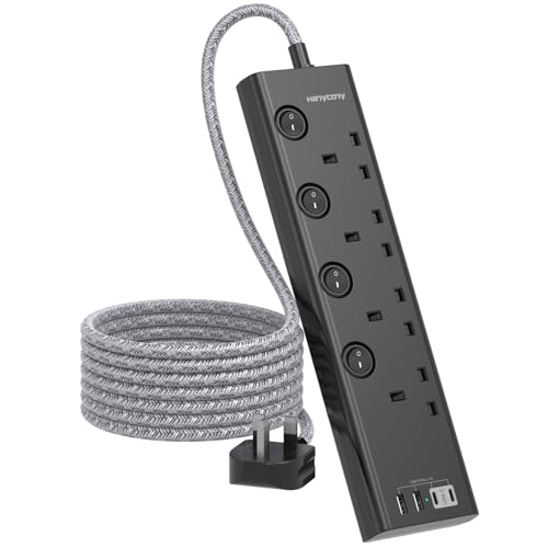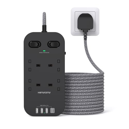 HANYCONY Black Extension Lead, 3M, 4 Outlets, 4 USB (1 USB-C),