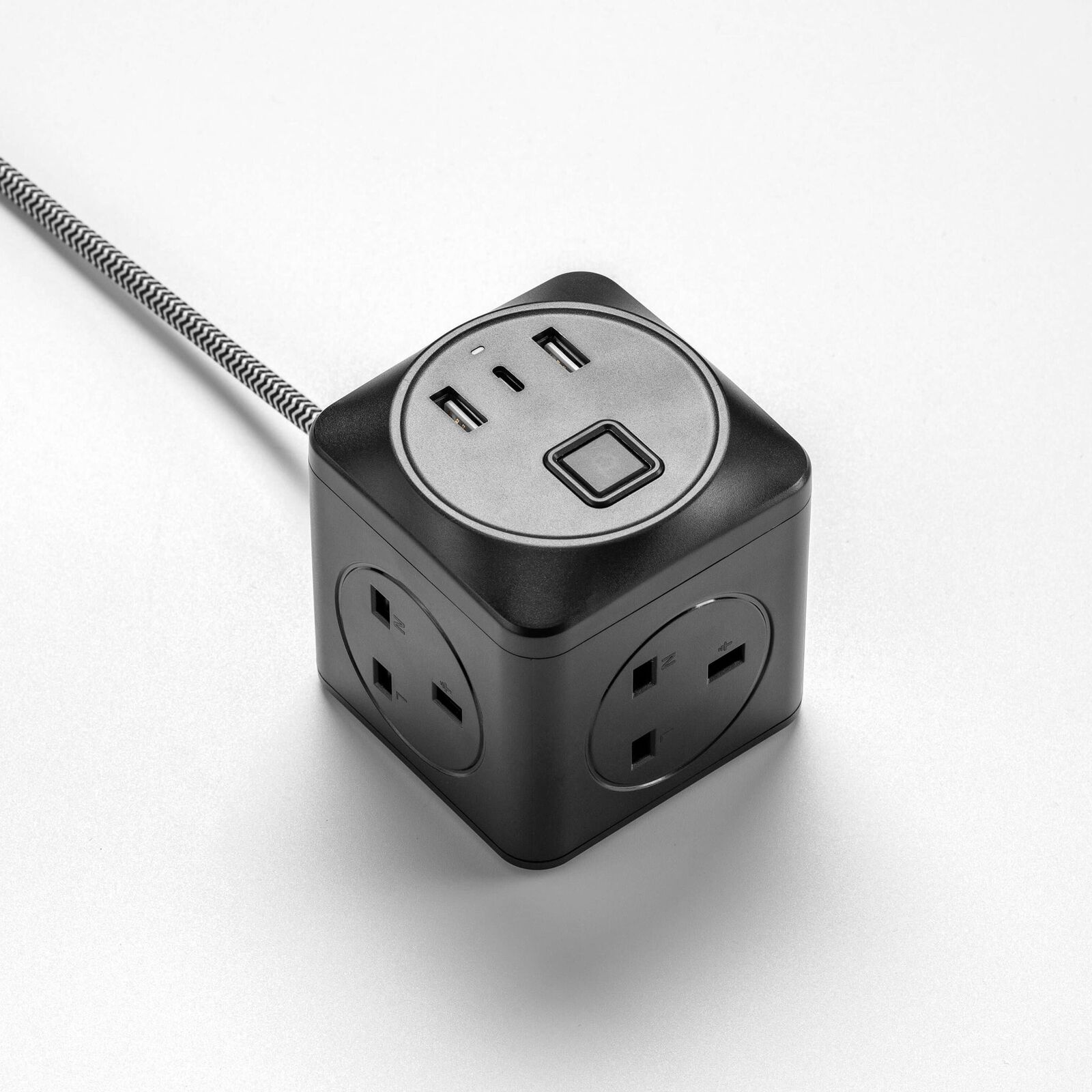 BLACK 2M EXTENSION LEAD CUBE WITH USB SURGE PROTECTED & WALL/TABLE MOUNTABLE