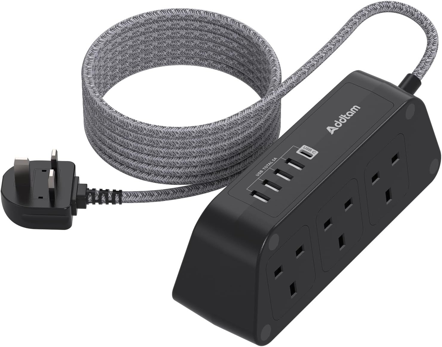 Black Extension Lead with USB Slots(3 USB), 3 Way Plug Extension Socket with Ind