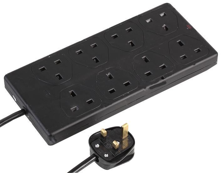 8 GANG WAY 2 METER BLACK SWITCHED EXTENSION LEAD UK MAINS