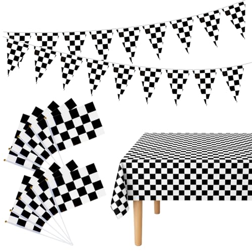 Hollylife Racing Party Decorations Supplies: 137 x 274cm Tablecloth, 20 Checkered Small Flags on Sticks, 30 Triangle Flags (Black, White)