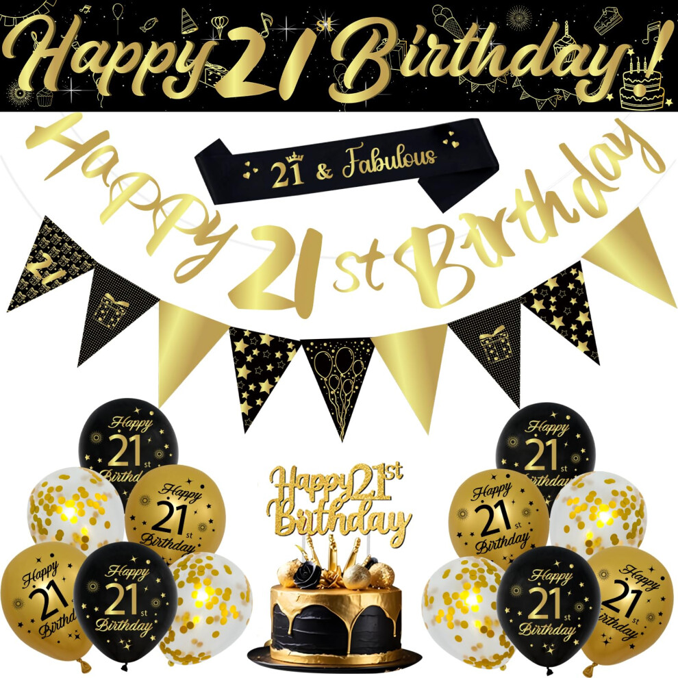 21st Birthday Decorations Set, 18Pcs Black Gold Balloons kit with Banners, Cake Topper, Triangle Flags, Black Gold and Sequin Balloons, Sash for Men