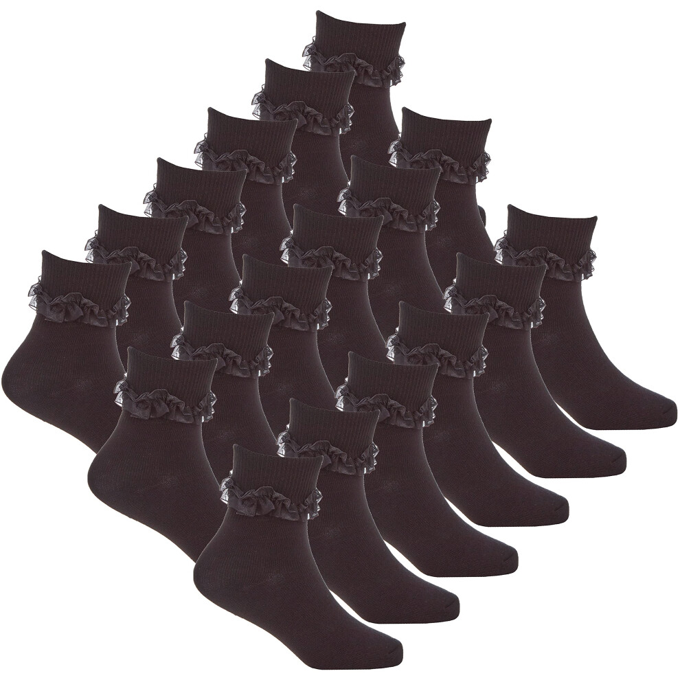 (Black - 9 Pairs, 6-8.5) 9 Pairs Girls 3 Pack Frilly Socks Organza Lace Frill Ruffle Back To School Cotton Rich Cute Uniform Bundle Multipack Multibuy