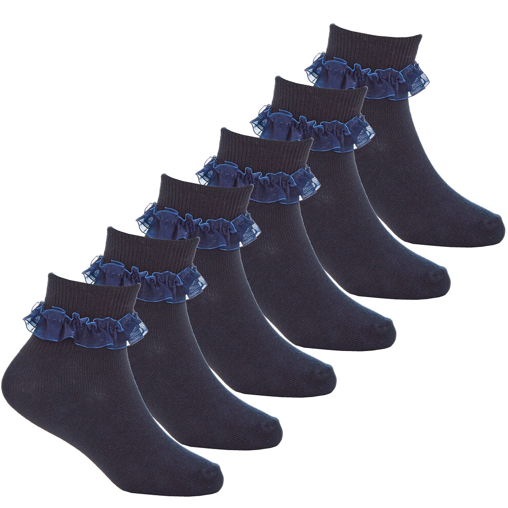 (Navy- 6 Pairs, 4-5.5) 6 Pairs Childrens Girls Frilly Socks Ankle Back To School Uniform Lace Ruffle Navy Black White Grey Size 6.5-5.5