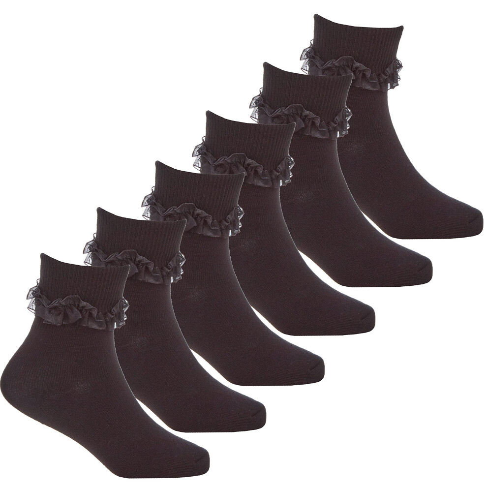 Prime Products 1/3/6/ X Pairs of Girls Frilly Lace Ankle Socks in Black & White Cotton Footwear (Black (6 Pairs), Shoe Size 12.5-3.5 (7-10 YRS))