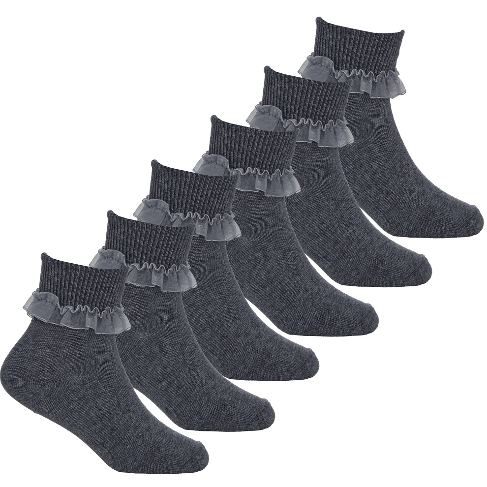 (Grey- 6 Pairs, 4-5.5) 6 Pairs Childrens Girls Frilly Socks Ankle Back To School Uniform Lace Ruffle Navy Black White Grey Size 6.5-5.5
