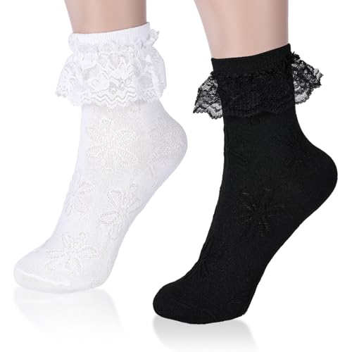 2 Pairs Frilly Socks Women, Black White Opaque Ruffle Lace Sock with Bow Girls Ankle School Rich Frilly Lace Princess Dress Socks