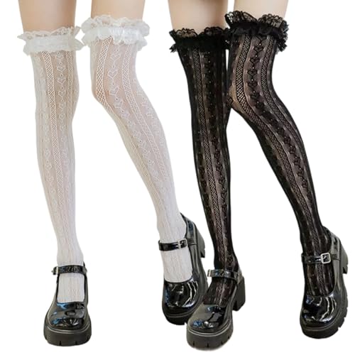 KWJEIULSOQ 4 Pairs Of Knee High Lace Socks, Lolita Frilly Socks for Girls, Fishnet Patterned Stockings for Women, White And Black
