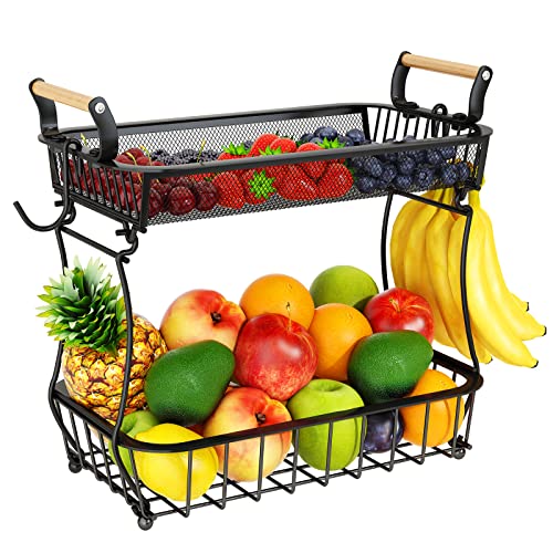 Mutool Fruit Basket, 2-Tier Bowl with Banana Hanger, Kitchen Black