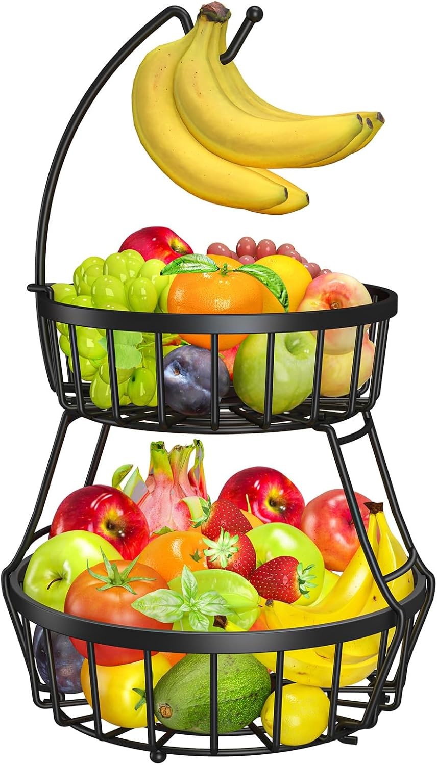 OrderlyGo Thicken Fruit Bowl Basket with Banana Hanger - 2-tier, Black