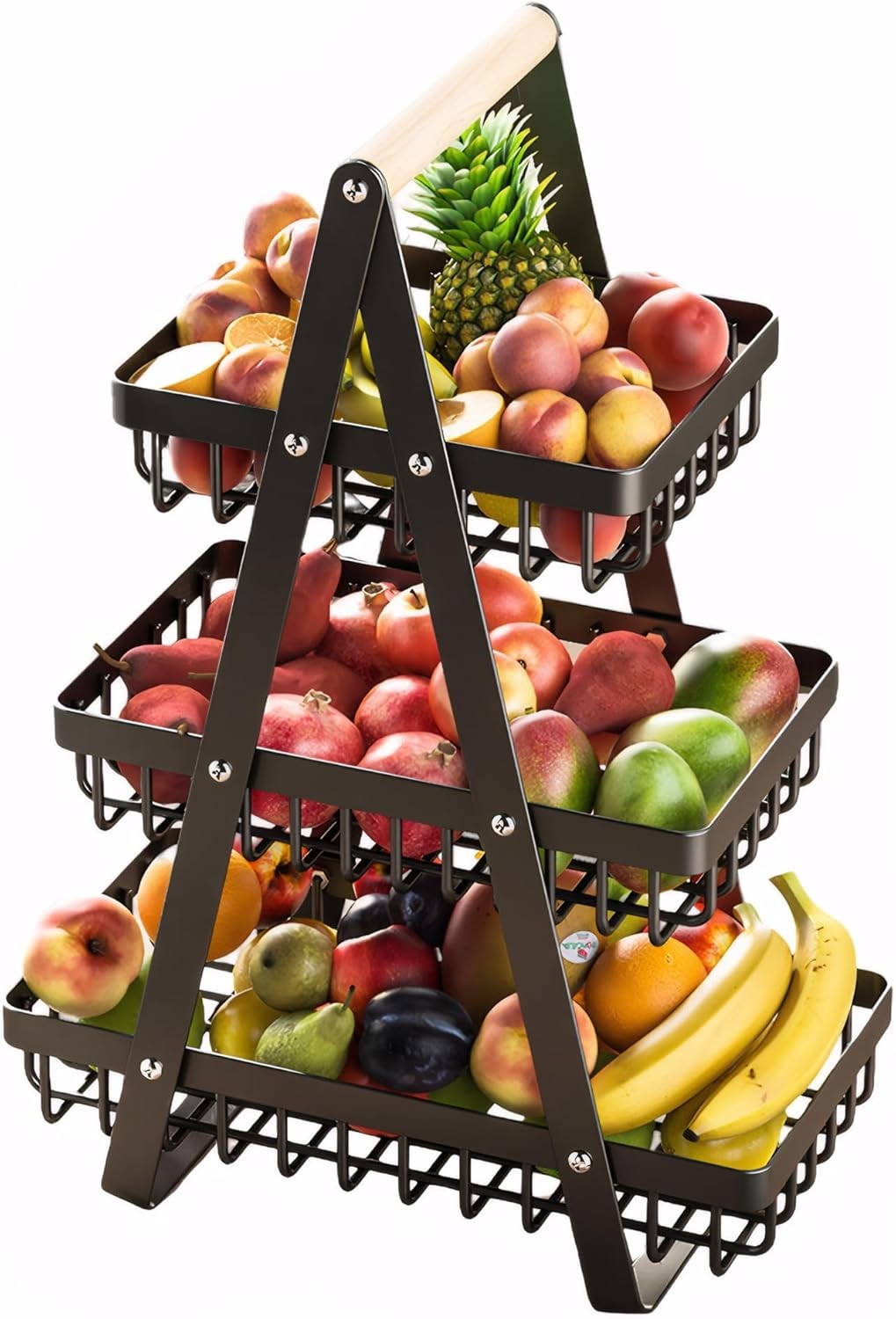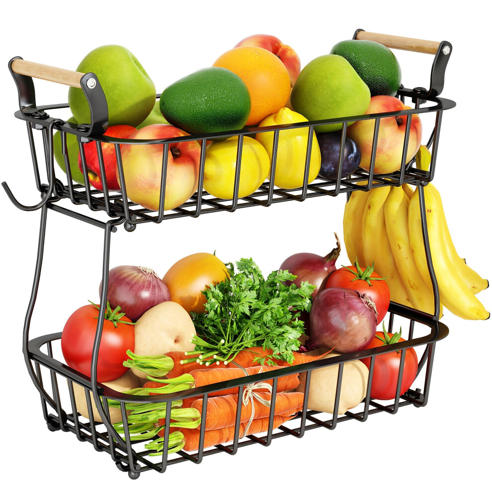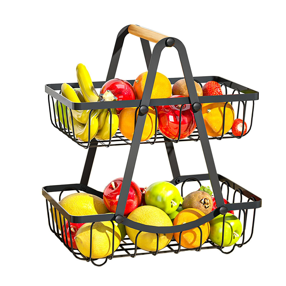 2 Tier Fruit Basket Black Metal Fruit Basket Bowl Holder with Wooden Handle