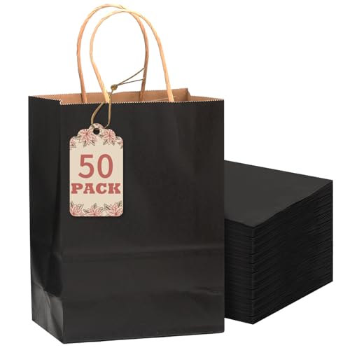 Gcardist 50-Packs Black Paper Gift Bags with Handles Bulk 8.3"x6"x3.15" Small Size Party Favor Bags Multiple Uses