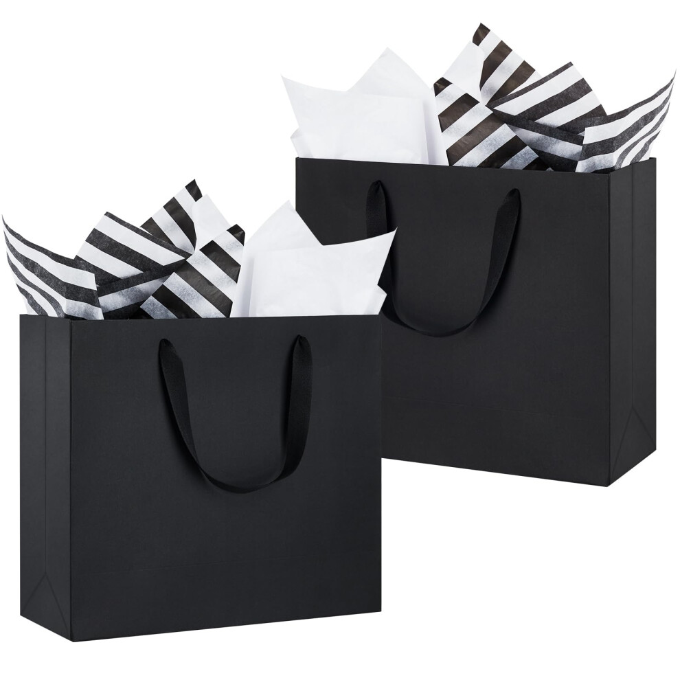 Ohuimrt 12 Pack 12"""" Large Gift Bags with Tissue Paper Black Kraft Paper Gift Bags with Ribbon Handles for Holiday Shopping Retail Merchandise Busin