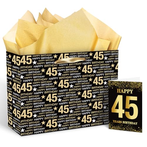 Black Gold 45th Birthday Gift Bag,45th Birthday Gift Wrap Bag With Tissue Paper and Card Gold Black 45th Birthday Gift Paper Bags Candy Wrapping Bags for Men Women 45th Birthday Party Supplies