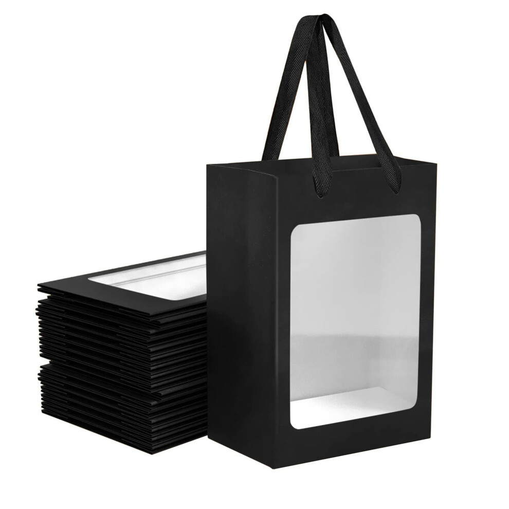 24 Pcs Black Kraft Paper Gift Bags with Transparent Window 9.84""""x7.0""""x5.12"""" Kraft Shopping Bags with Handles for Present Festivals Party