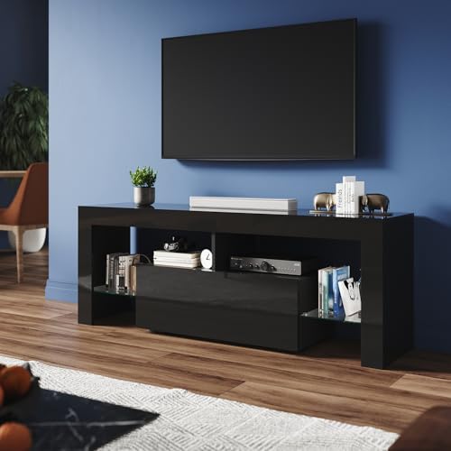 ELEGANT TV Stand Cabinet Unit with 16 RGB LED Lights, High Gloss TV Stand with Large Storage and 1 Big Drawer, Modern Black TV Cabinet with 2 Glass Shelf for Living Room, Bedroom 1600x350x505mm