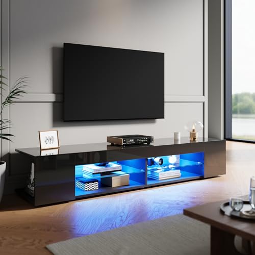 ZANOFIRA TV Stand Cabinet Unit with 16 RGB LED Lights, High Gloss Black TV Stand with Glass Shelves & 2 Storage Compartments, 1800 x 390 x 300mm