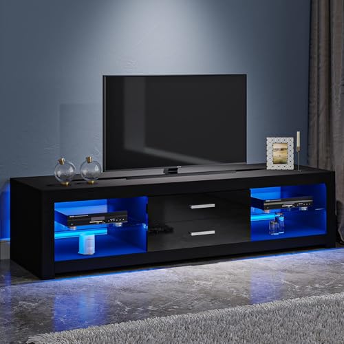 Panana TV Stand Cabinet 2 Drawer 2 Glass Shelves LED Lighted TV Console Unit for 22"-55" Flat Screen 4k TVs (black)