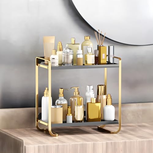 LuxFlowing 2 Tier Small Bathroom Counter Organizers and Storage, Perfume Holder, Makeup, Lotion, Cosmetic, Skincare, Hair Product Shelf for Dresser, Restroom Countertop (Gold and Black)