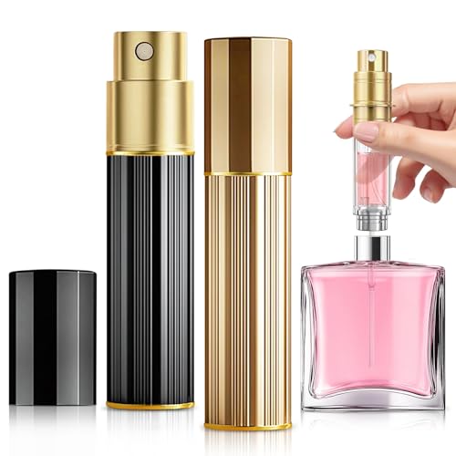 Vinuwu Refillable Perfume Atomiser 2 Pack 5ml, Mini Travel Aftershave Dispenser, Small Perfume Spray Bottle, Pocket Size Bottom Filling Perfume Dispenser for Women and Men (Black+Gold)