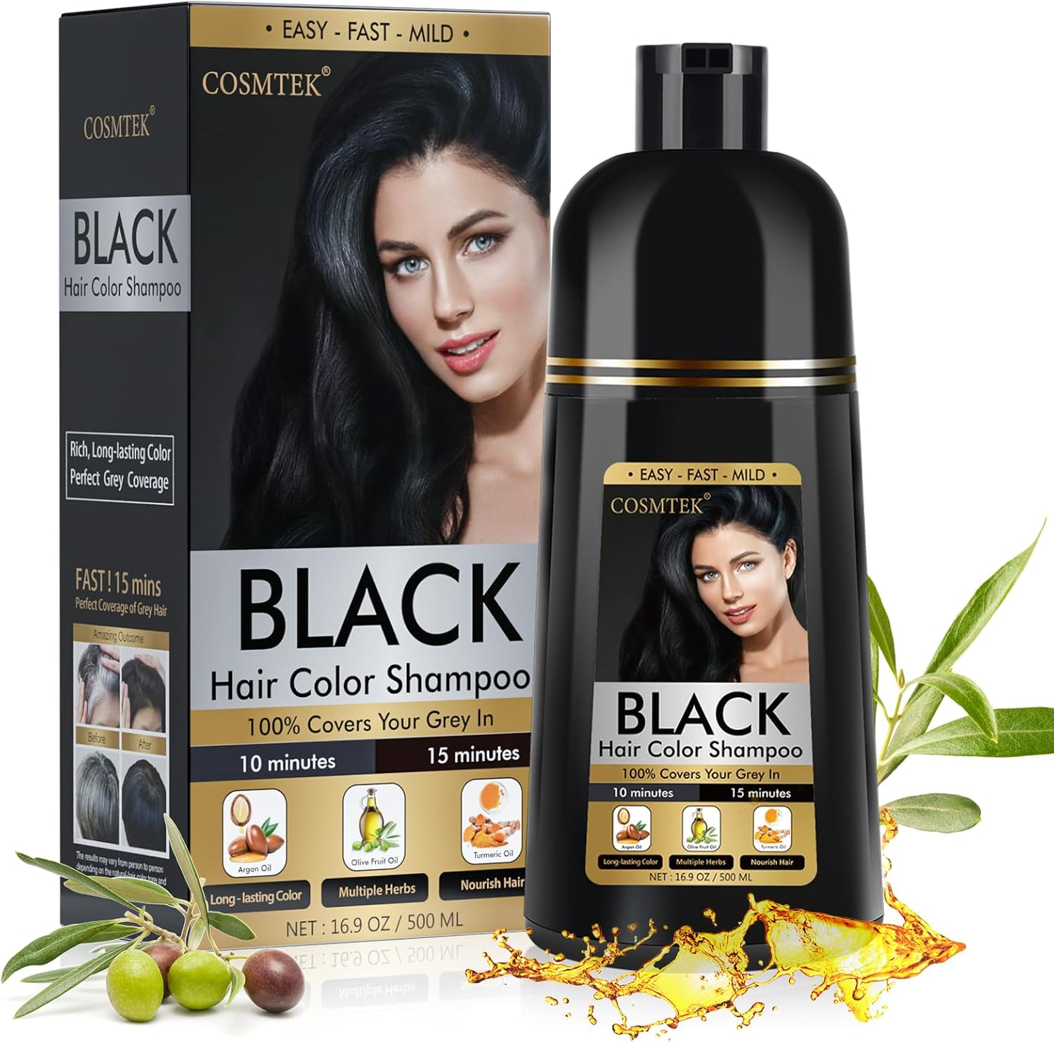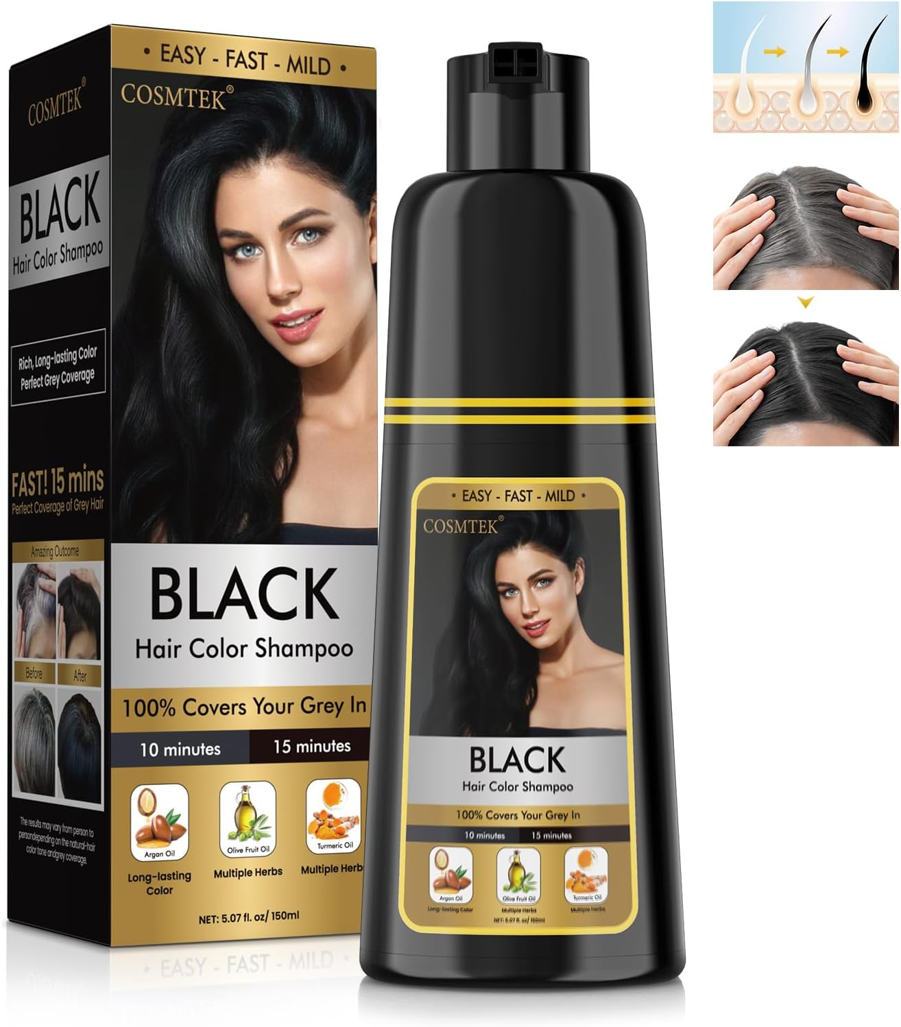 COSMTEK Black Hair Dye Shampoo, 3 in 1 Color Shampoo for 100% Gray Hair Coverage