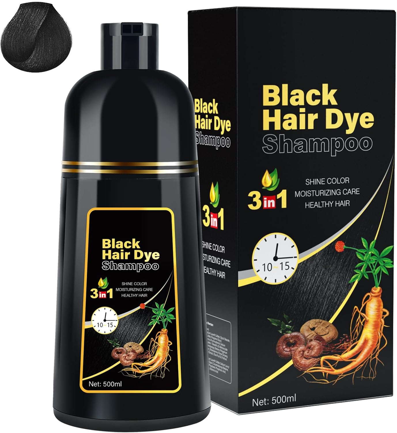 Black Hair Dye Shampoo 3 in 1, Hair Color Shampoo for Gray Hair Coverage,Natural Dye Semi Permanent Color for Women and Men, 500ML (Black)