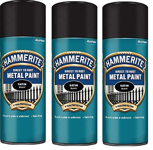 Hammerite Spray Paint for Metal. Direct to Rust Exterior Black Metal Paint, Satin Finish. Corrosion Resistant Black Paint and Rust Remover, 8 Year Protection - 400ml Aerosol 0.5 SqM Coverage