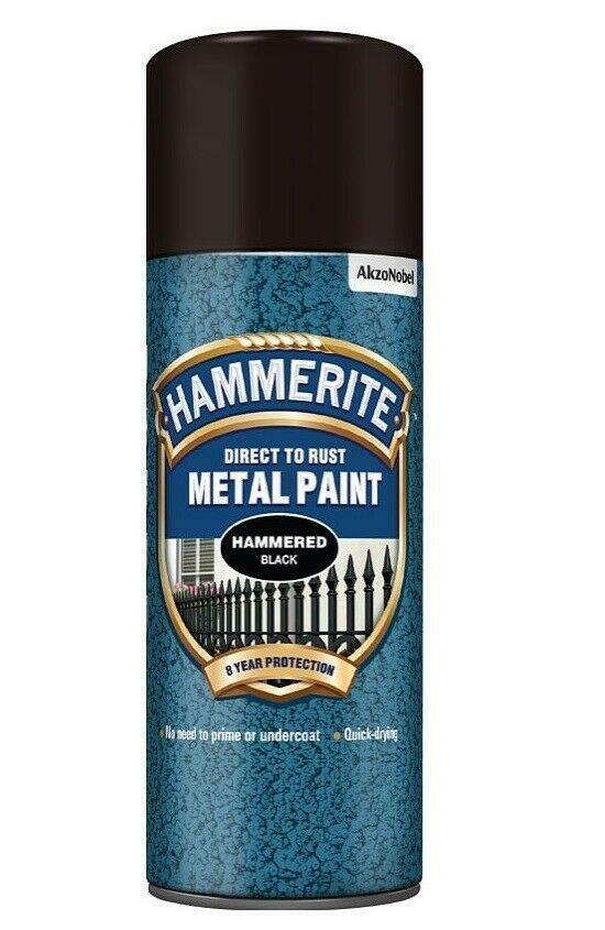 Hammerite Spray Paint for Metal. Direct to Rust Exterior Black Metal Paint, Hammered Finish. Corrosion Resistant Black Paint and Rust Remover, 8 Year Protection - 400ml Aerosol 0.5 SqM Coverage