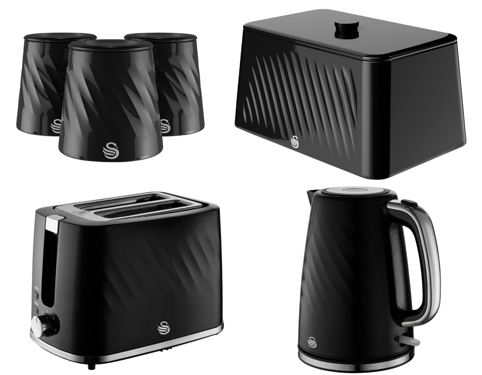Swan Windsor Black Kettle Toaster Breadbin Canisters Matching Kitchen Bundle Set