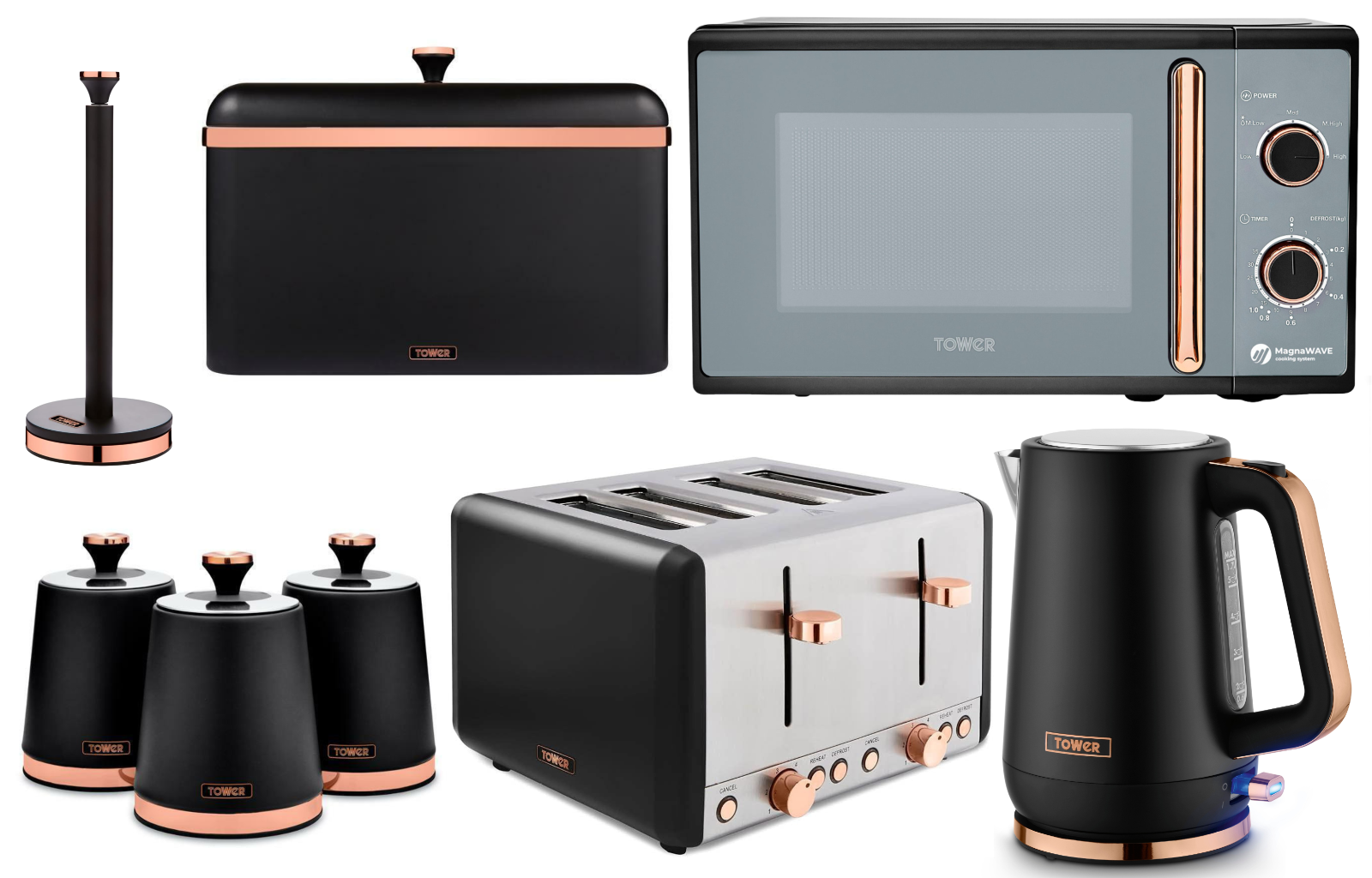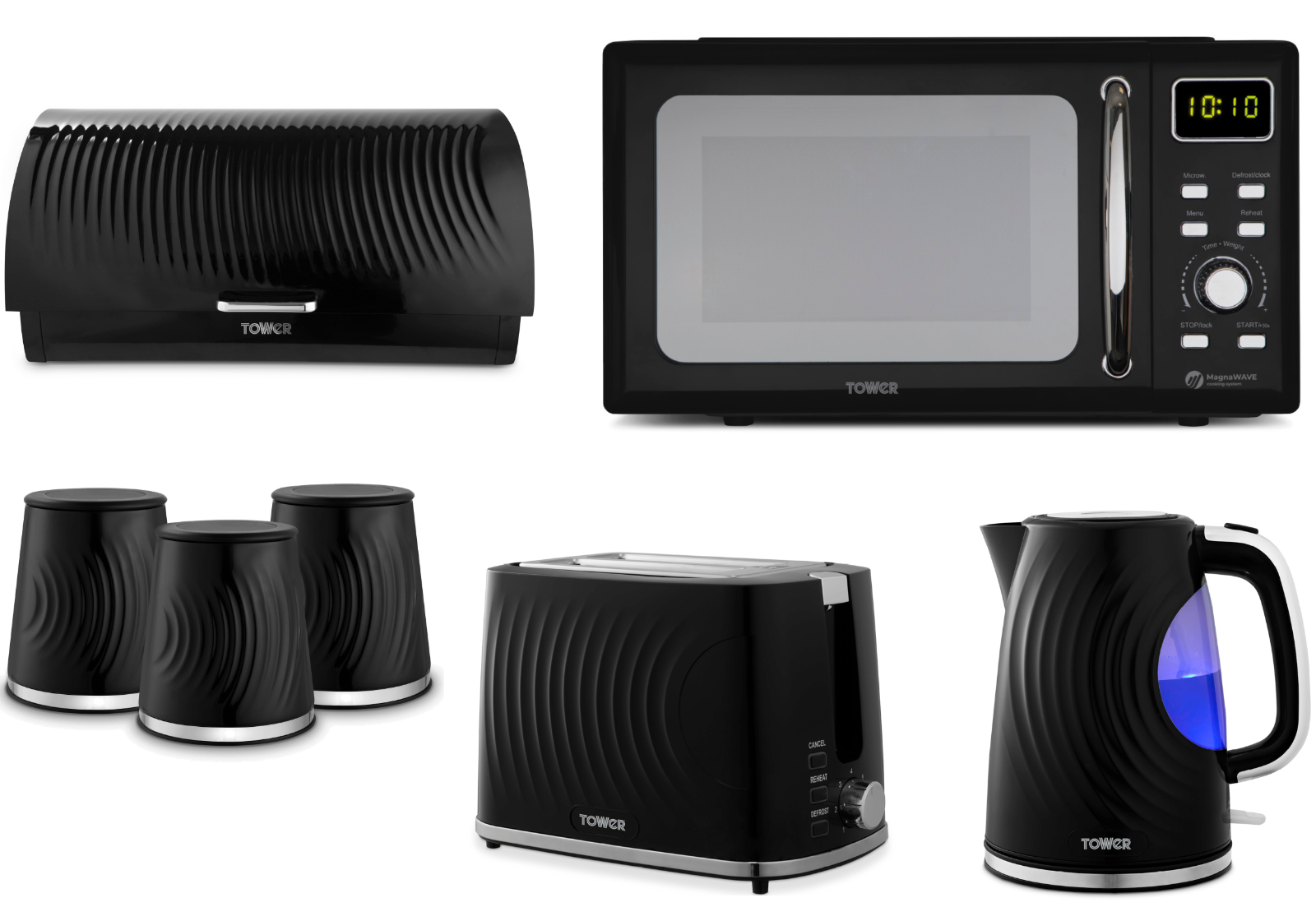 Tower Cavaletto Black Jug Kettle Toaster Microwave Breadbin Canisters Set