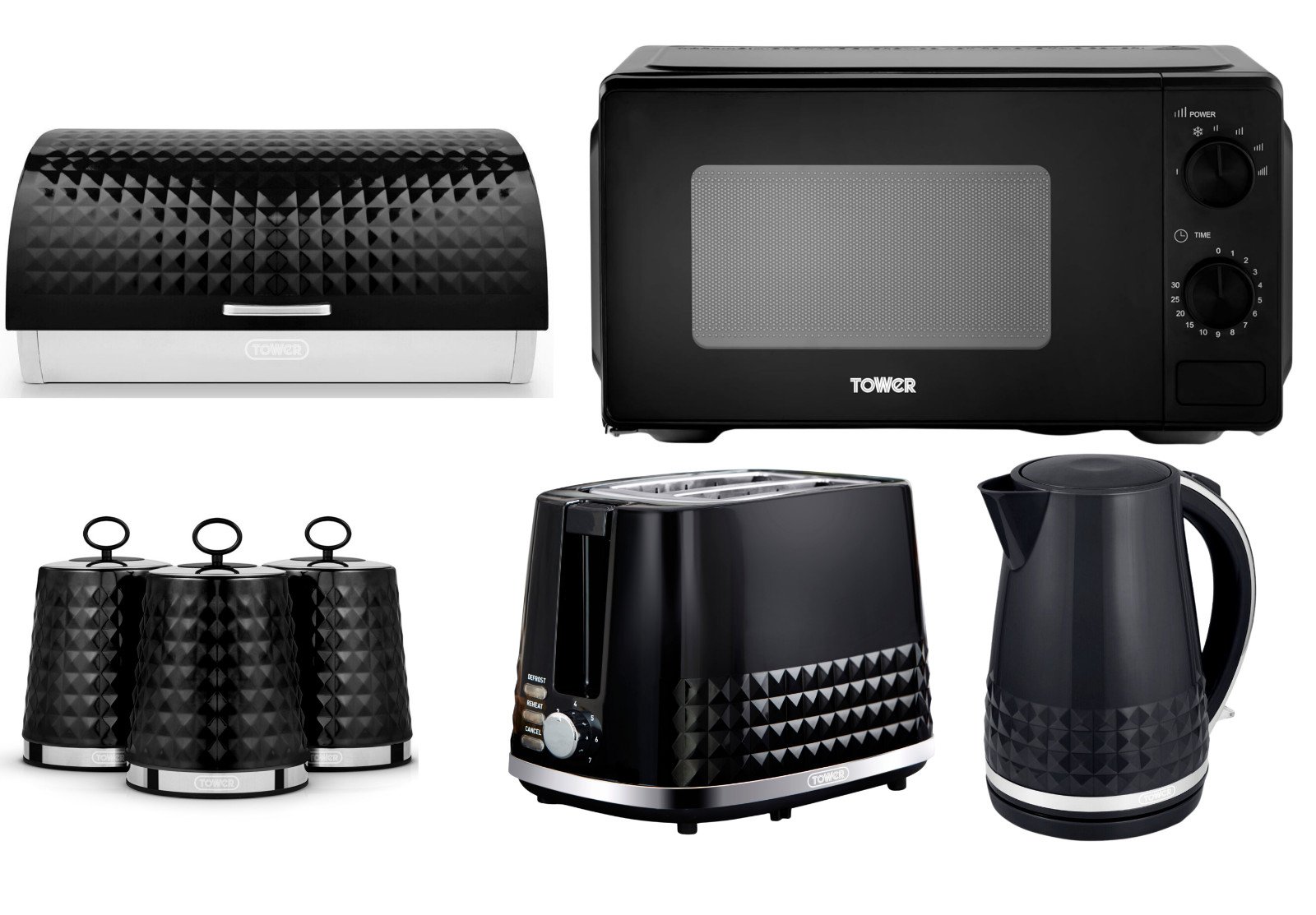 Tower Solitaire Black Kettle Toaster Microwave Bread Bin Canisters Kitchen Set