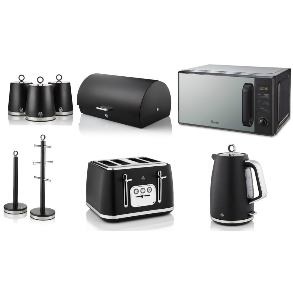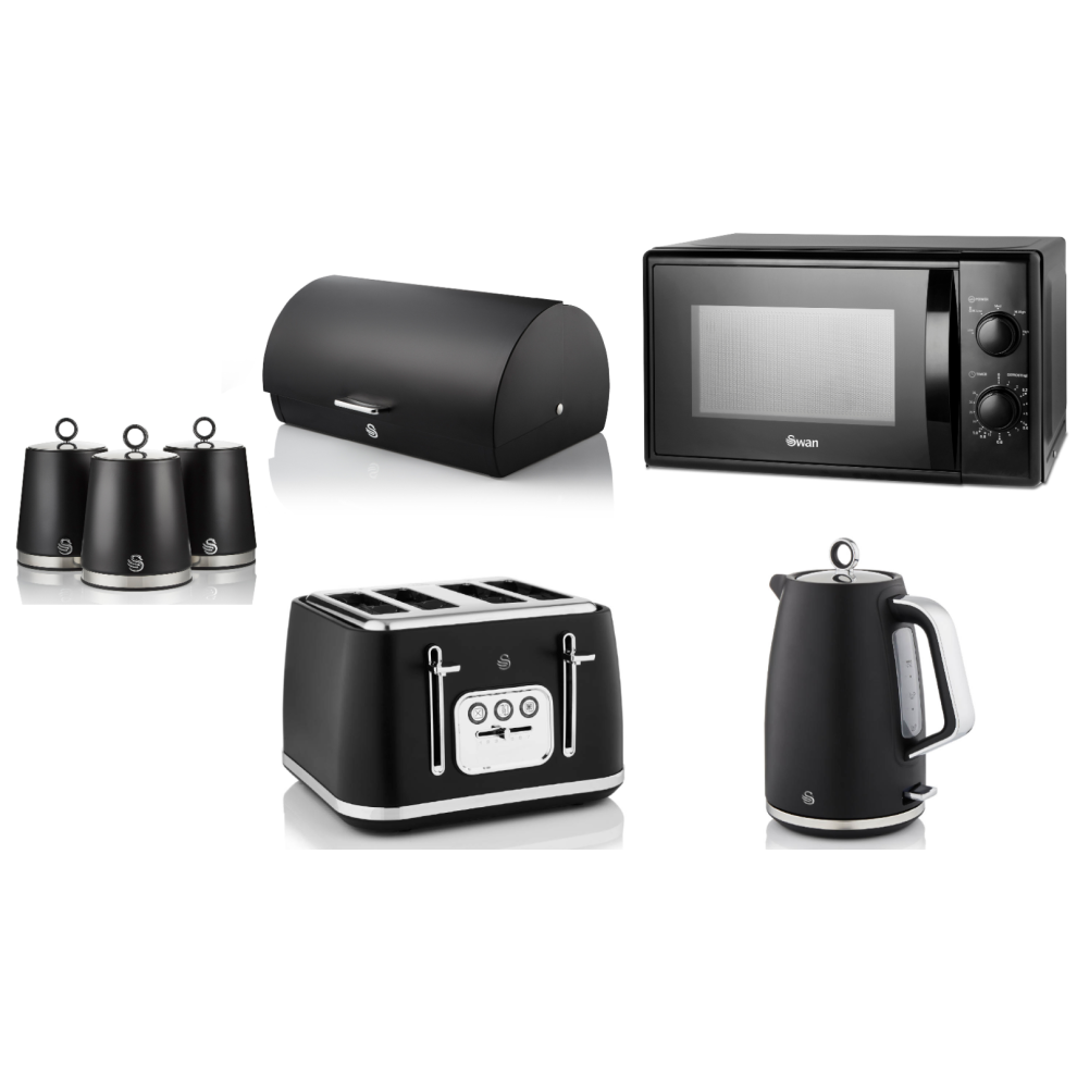 Swan Solace Black Kettle Toaster Microwave Breadbin & Canisters Kitchen Set