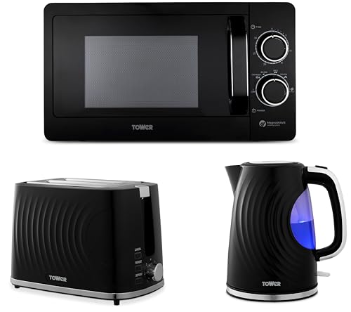 Tower Sonar 1.7L 3KW Kettle, 2 Slice Toaster & T240242BLK 800W 20L Microwave in Black. Stylish Kettle, Toaster Set & Microwave Set