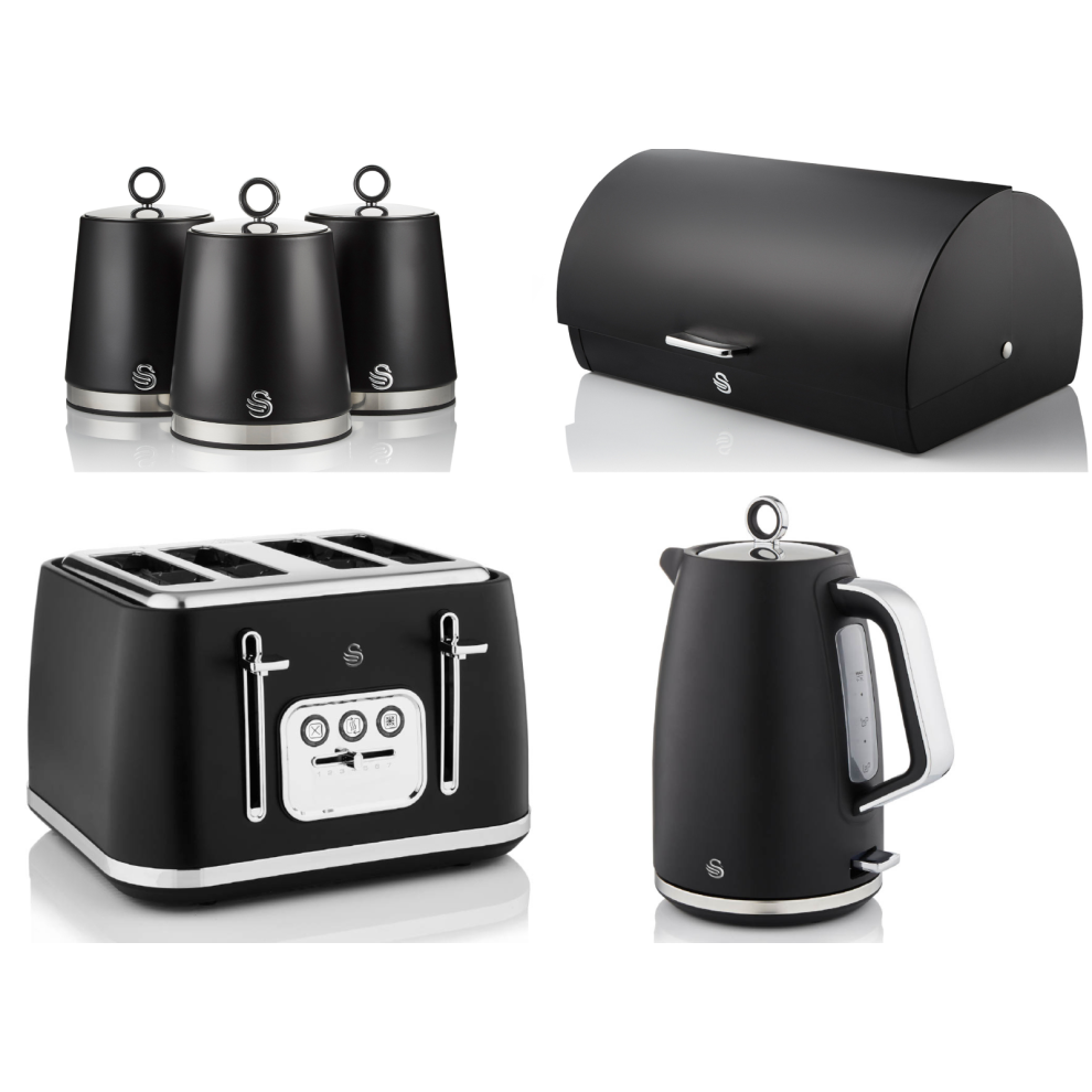 Swan Serenity Black Kettle Toaster Bread Bin & Canisters Matching Kitchen Set