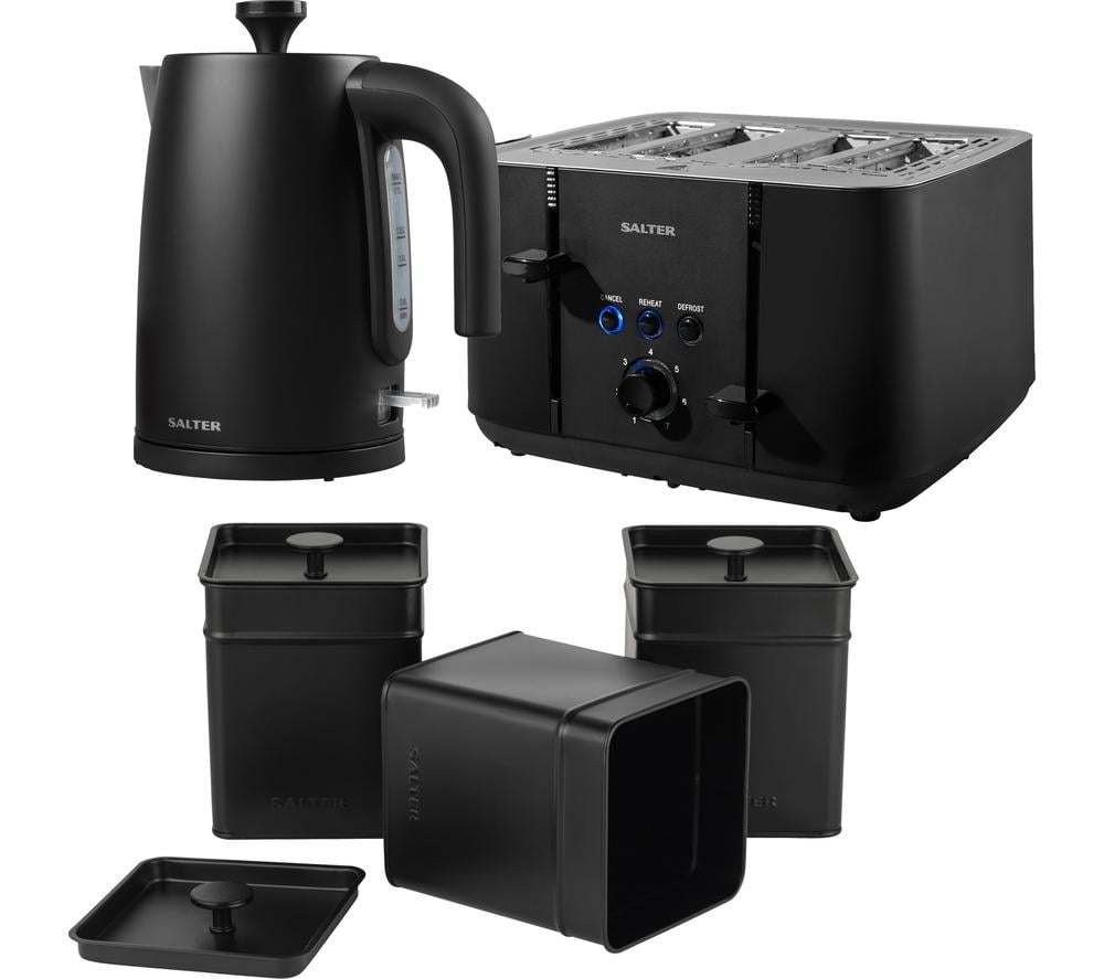 SALTER Kuro Kettle, 4-Slice Toaster & Storage Cannister Set Bundle - Black, Black