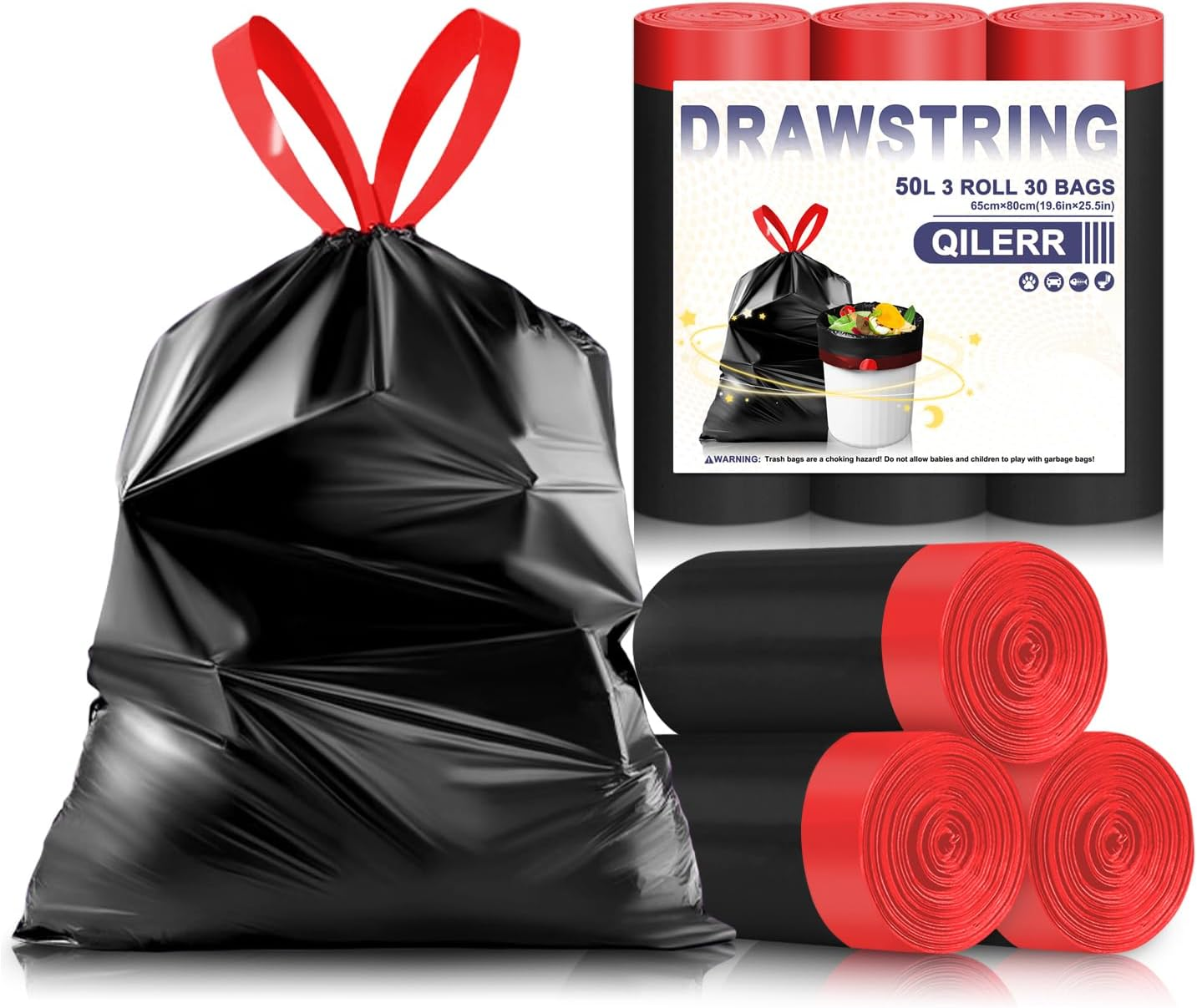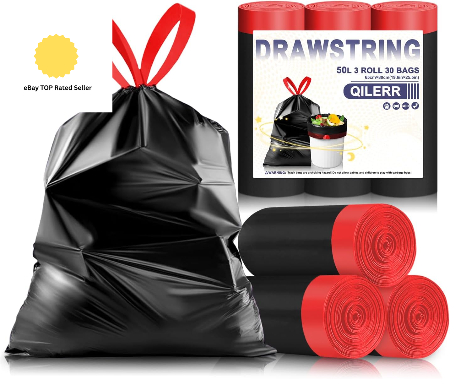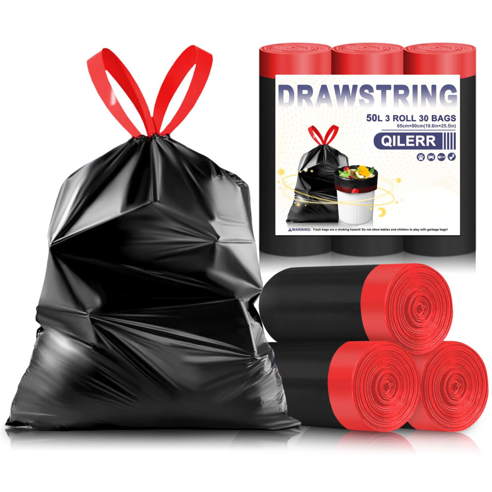 QILERR 50L Black Bin Bags with Tie Handles heavy duty Kitchen Wheelie Bin Liners 30 Count Extra Thick Leakproof Rubbish Bags Reinforced Waste Sacks