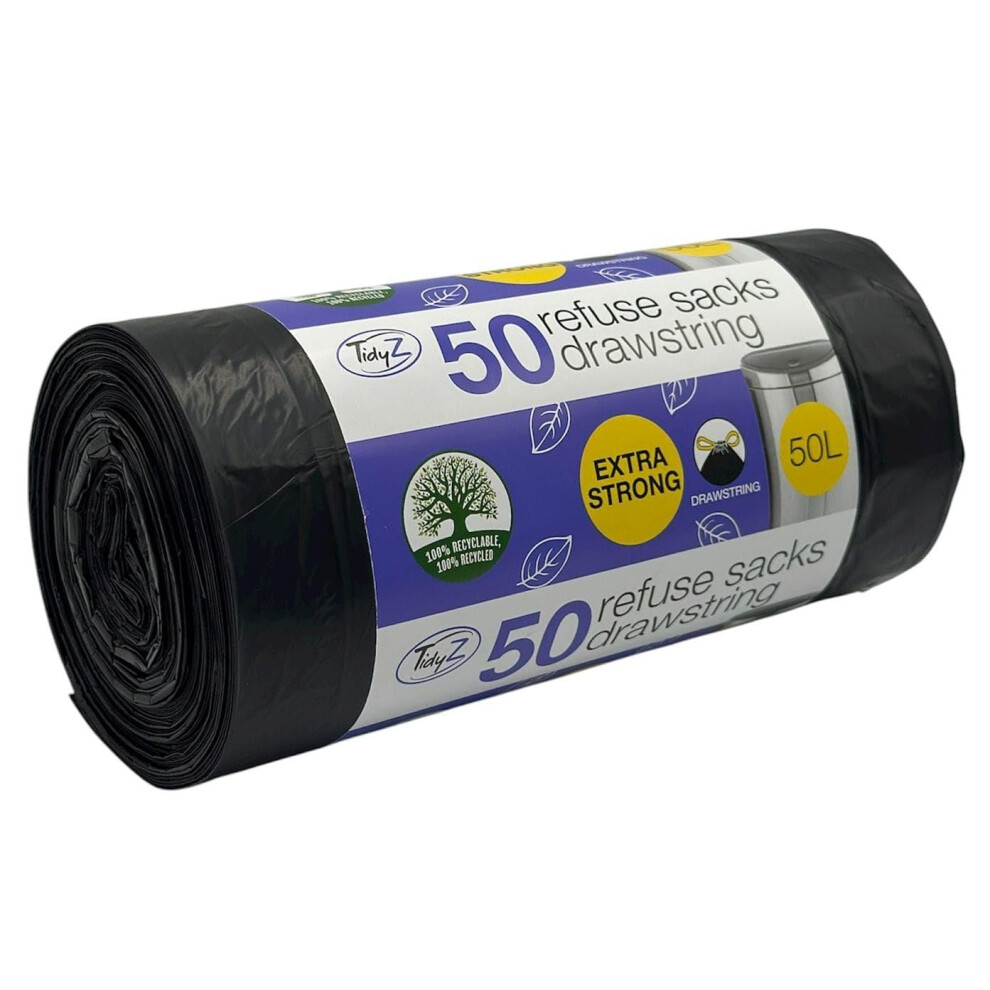 50 TidyZ Heavy-Duty Black Bin Bags. Made from 100% Recycled Plastic. Extra Strong Refuse Sacks. With Drawstring. 50L. For Kitchen, Office, General Ho