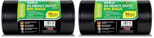 Delka Heavy Duty Black Bin Bags – Extra Strong, Leak-Proof Plastic Liners – Ideal for Kitchen, Home, DIY & Garden, Household, Office & Catering – Made from 100% Recycled Material (50L, 25 Pack)