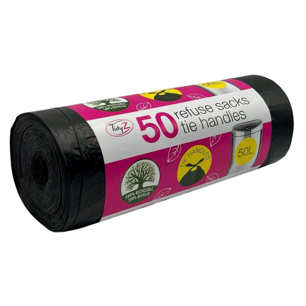 50 TidyZ Heavy-Duty Black Bin Bags. Made from 100% Recycled Plastic. Extra Strong Refuse Sacks with Tie Handles. 50L. For Kitchen, Office and General Household Waste