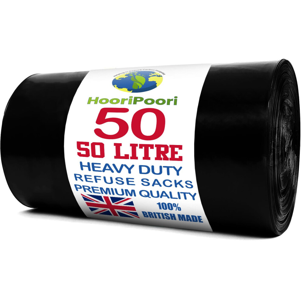 HooriPoori 50L 50 Bin Bags Heavy Duty Bin Liners, Black Plastic Refuse Sacks large Garbage Waste Dustbin Bags for Kitchen Home Office DIY Garden from