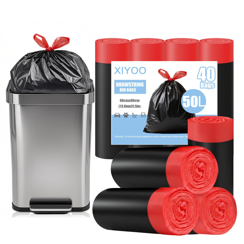 XIYOO Heavy-Duty Black Bin Bags 50L Bin Liners with Drawstring Handles 40 Count Swing Rubbish Bags Kitchen Trash Bags Waste Sacks fit 45-60L