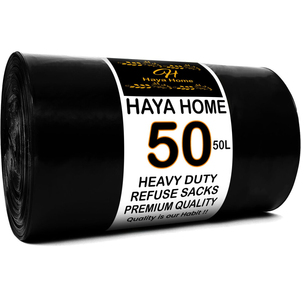 Haya Home 50L 50 Bin Bags Heavy Duty Bin Liners, Black Plastic Refuse Sacks large Garbage Waste Dustbin Bags for Kitchen Home Office DIY Garden from 100% Recycled Material