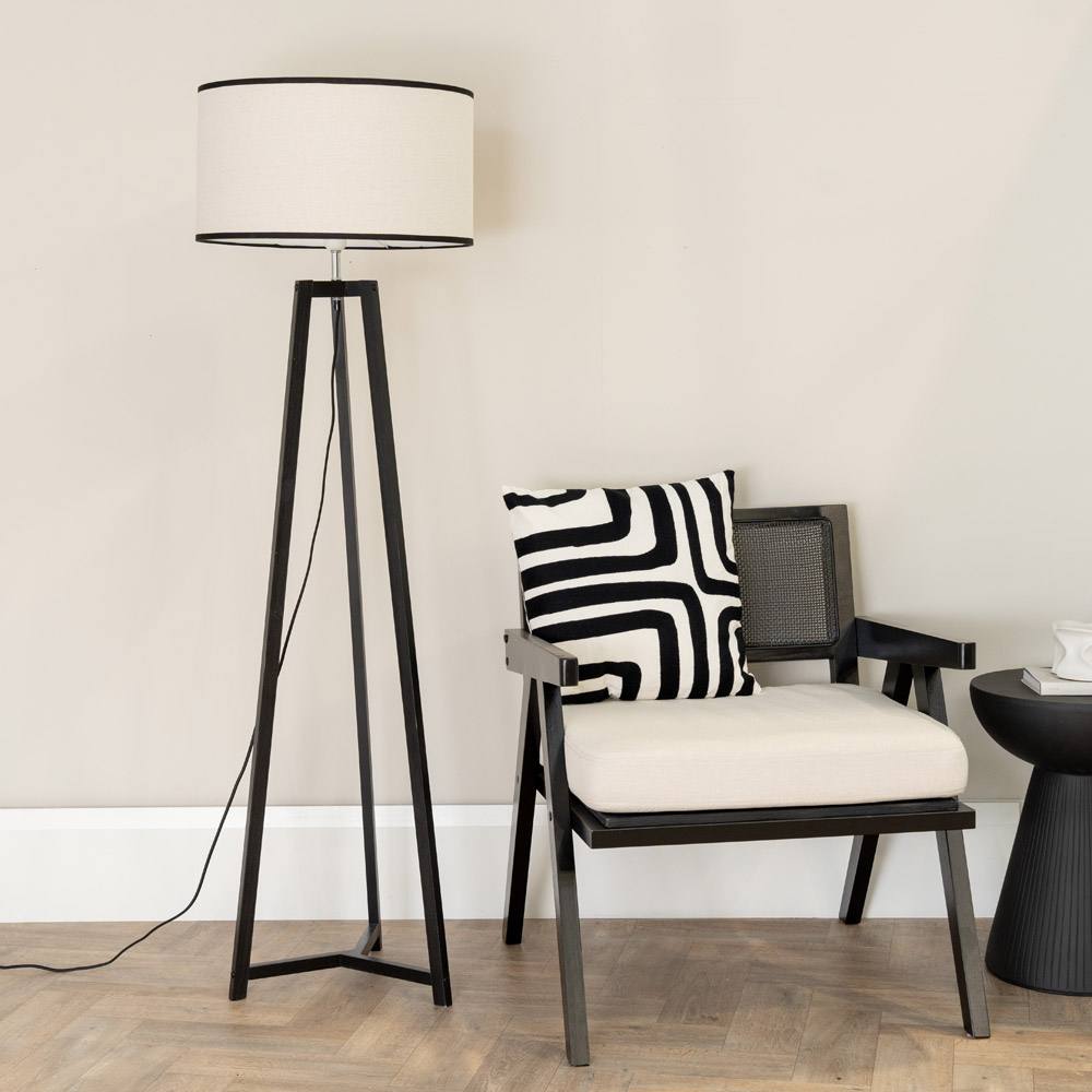ValueLights Lottie Black Wood Tripod Floor Lamp with Linen Black Trim Drum Lamp Shade