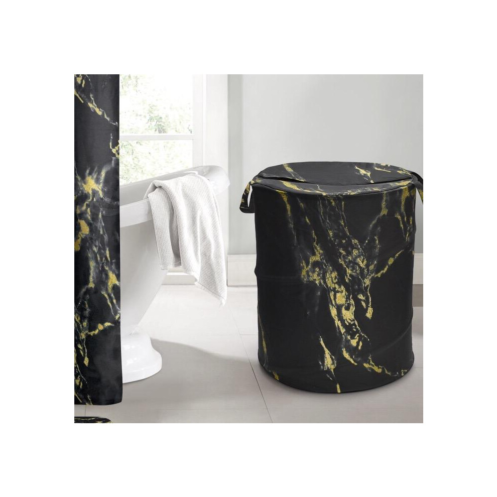 (Black and Gold Laundry Basket) Marble Effect Shower Curtain Set With 12 Hooks Black 180x180cm Waterproof Shower Curtains Durable, Easy to Clean & Sty